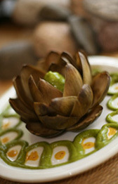 *Over many years at Miya’s, I have chopped apart thousands of pounds of artichokes to be rolled into sushi and to be served steamed with a side of my six month aged hot and frothy jalapeño dip. Why am I so into this vegetable? I can’t help but wonder…is little me still searching for that apple?